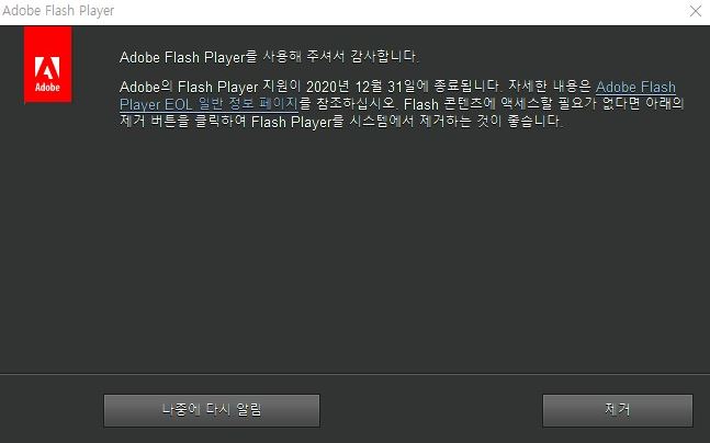 Adobe가 2020년 12월 31일부로 Flash Player에 대하여 배포 및 업데이트를 중단하기로 발표했습니다.